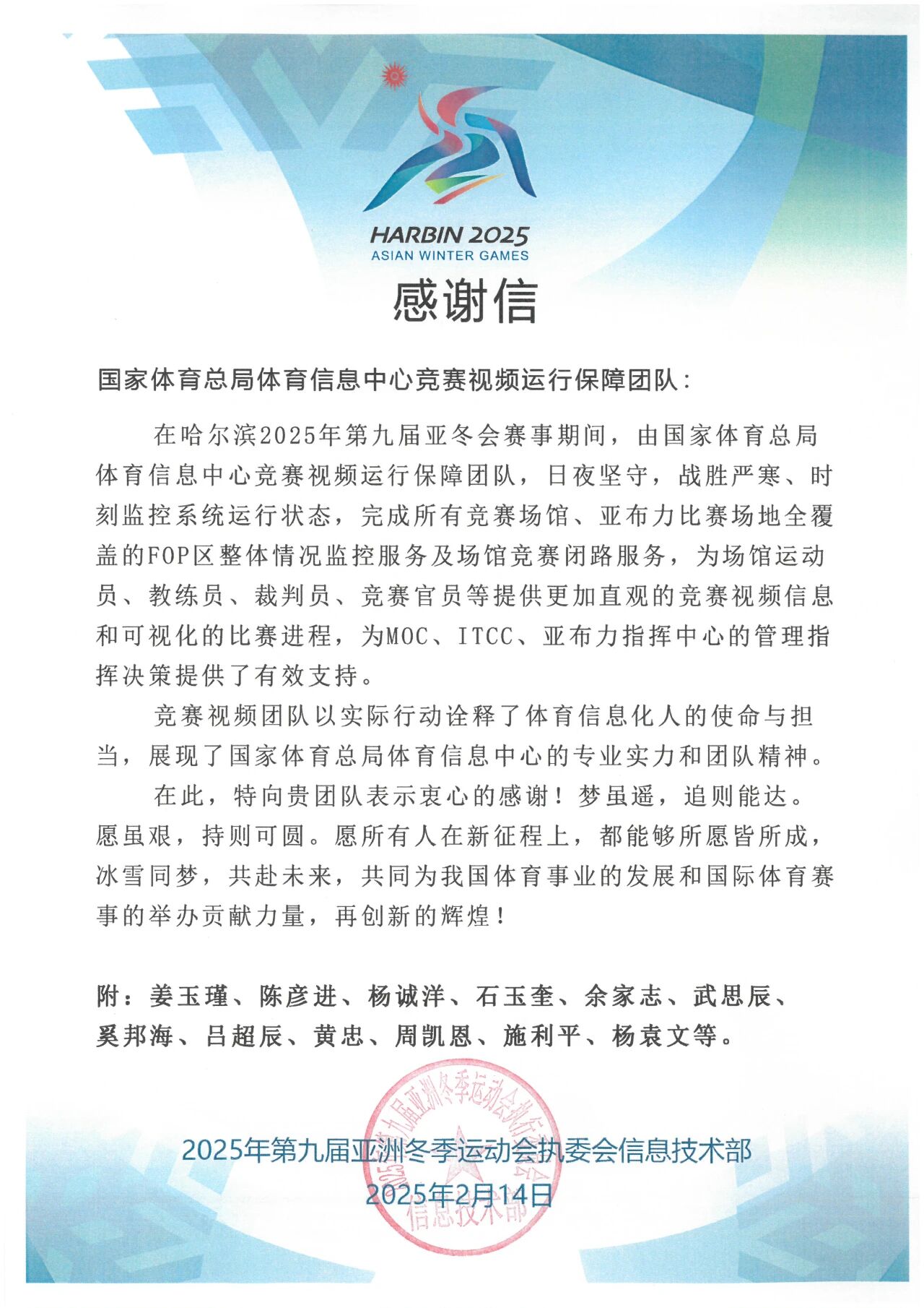 賽后,第九屆亞冬會執(zhí)委會向金陵體育發(fā)來感謝信,感謝金陵體育為哈爾濱亞冬會的成功舉所作的貢獻(xiàn)。