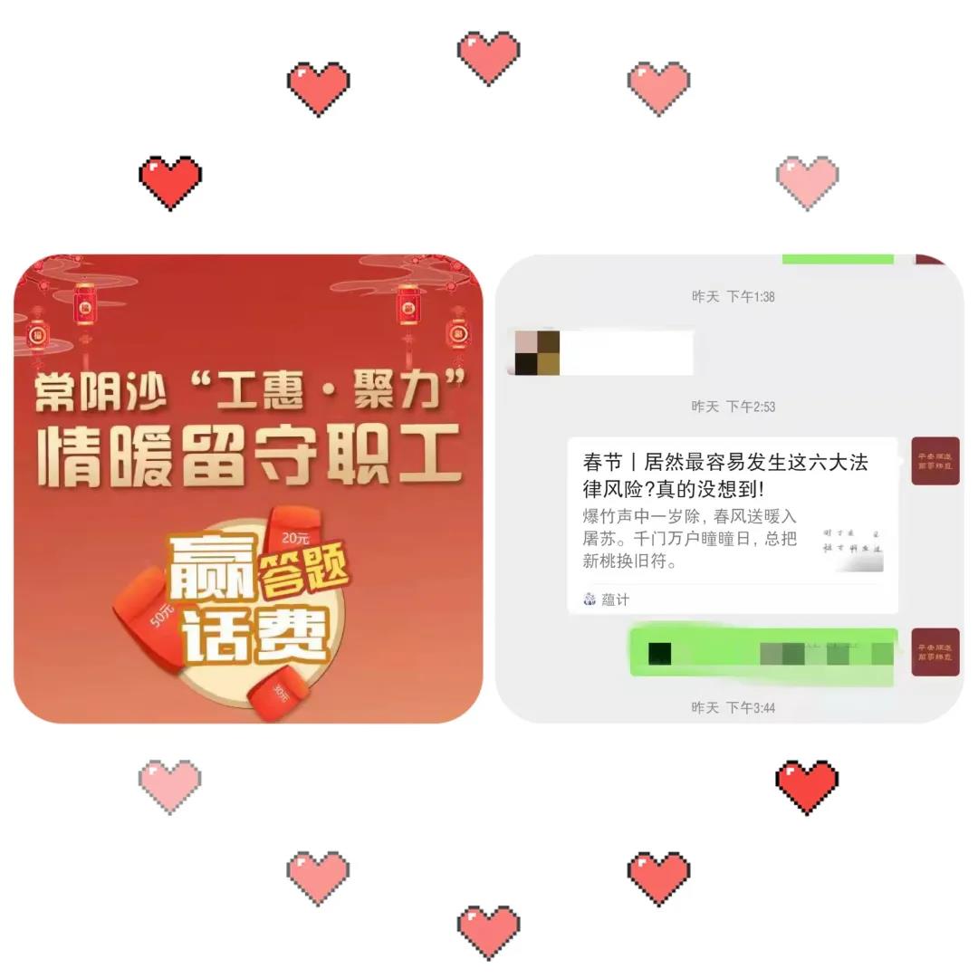 正月初一至初五常陰沙工聯(lián)會線上開展新春答題贏話費活動。通過微信群等推送“以案釋法”案例等方式,為留守職工宣傳“喝酒不開車,開車不喝酒”“喝酒需謹(jǐn)慎,勸酒須擔(dān)責(zé)”等春節(jié)期間常見問題,同時也宣傳了疫情防控信息和知識。